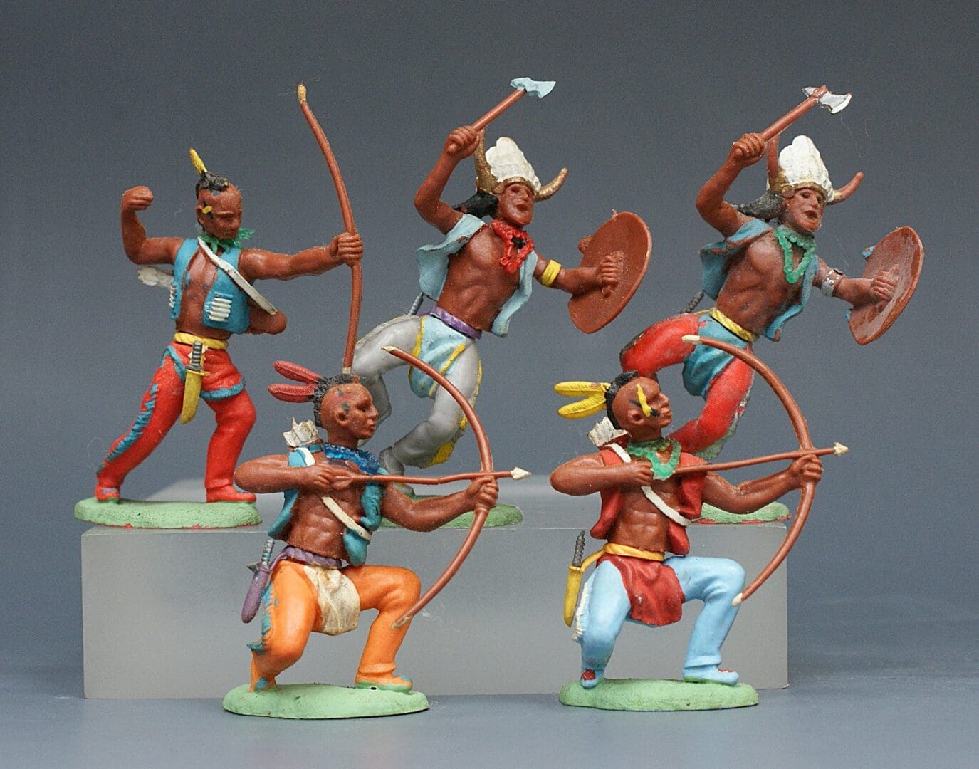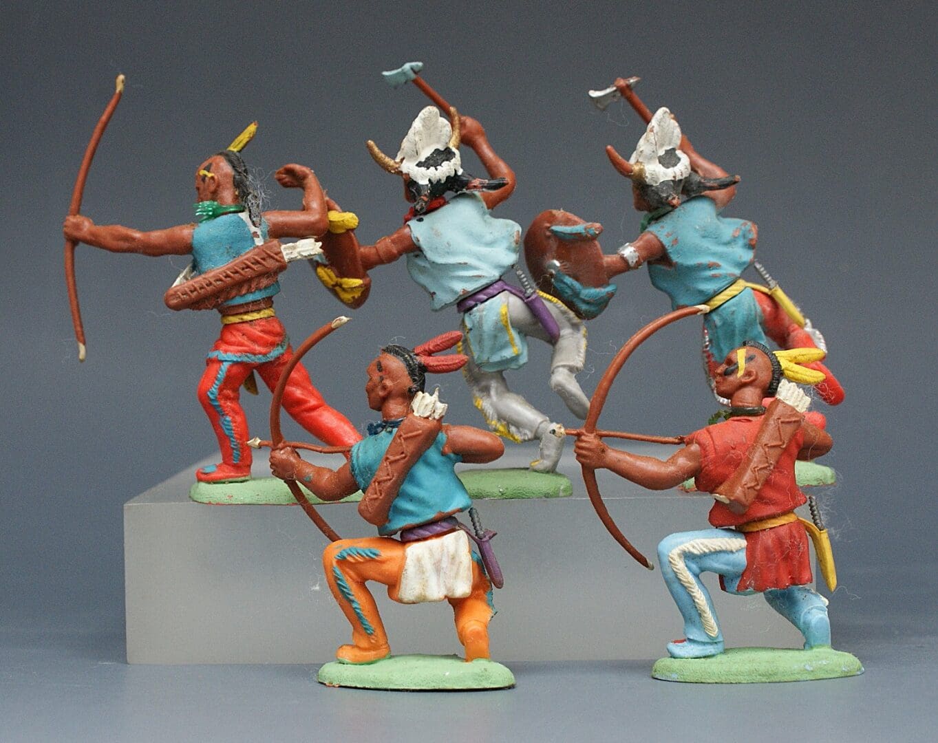 Britains (Herald) – Group of 5 (3 different poses) ‘Swoppet’ Dismounted Indians Cat. Nos. 550 to 554. All in Excellent lightly used condition, complete with belts, daggers and necklaces [From the ‘Roger Saunders’ Collection – 5 pieces]