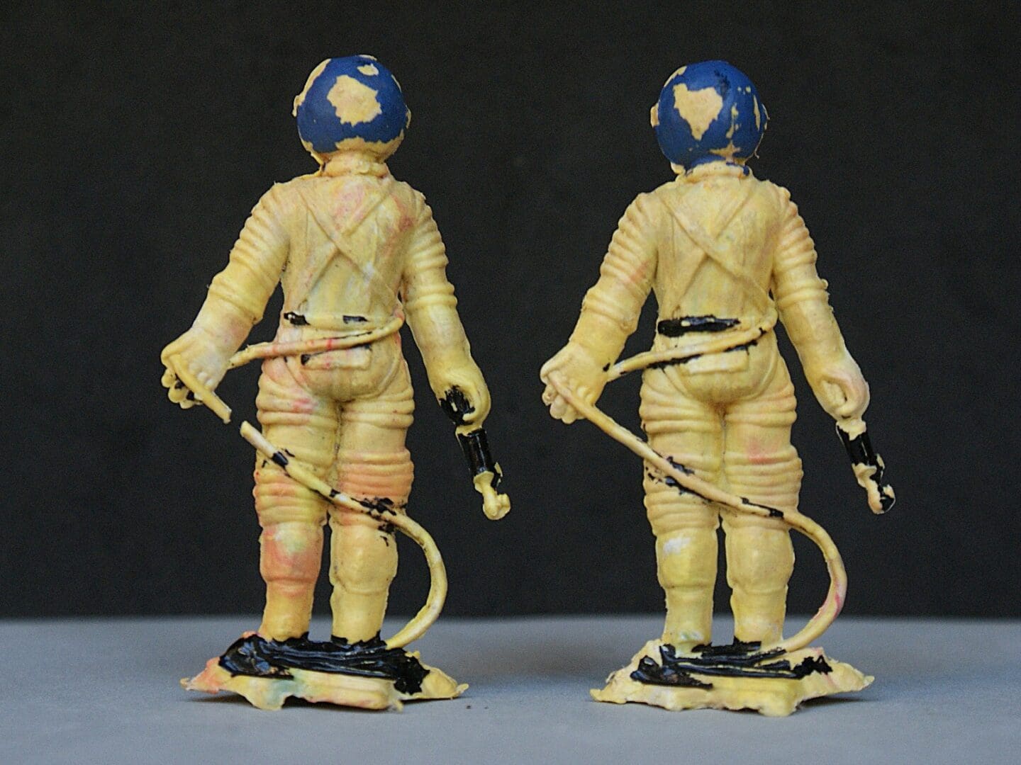 Gemodels Spacemen, catalogue no. A1 – moulded in Yellow swirly polythene, with light blue painted space helmets and black bases. Figures are in Good used condition – Plastic 50mm scale [2 pieces]