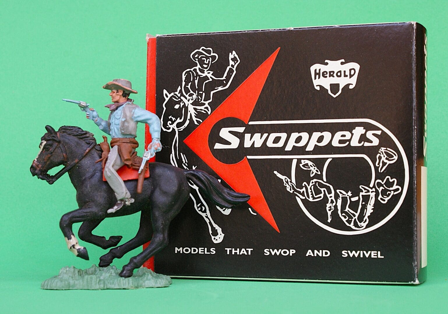 Herald ‘Swoppets’ 1st Series Cowboy Models – No. H633 Firing Twin Guns Mounted, early LIGHT BLUE torso with GREY painted waistcoat, 1st issue, Black plastic galloping horse, in Good used condition, complete with gun-belt, purple neckerchief, etc – dates from circa 1958 – nice EARLY example – includes a superb quality limited edition professionally produced REPRODUCTION 1st issue Red/Black carton with authentic-looking ecru packing tissue [Provenance: from the ‘Sussex’ Wild West Collection] *** Sorry now out of stock ***