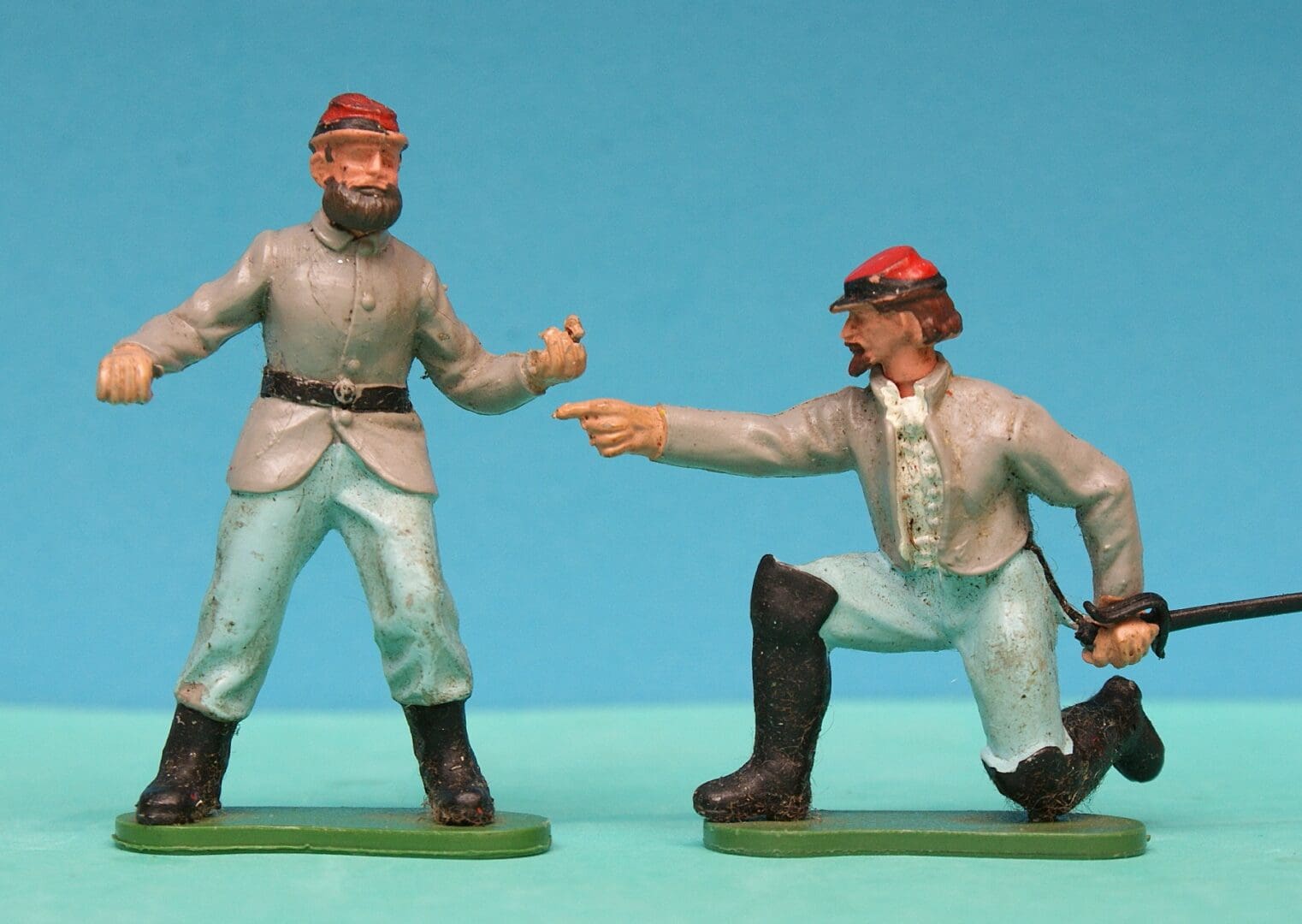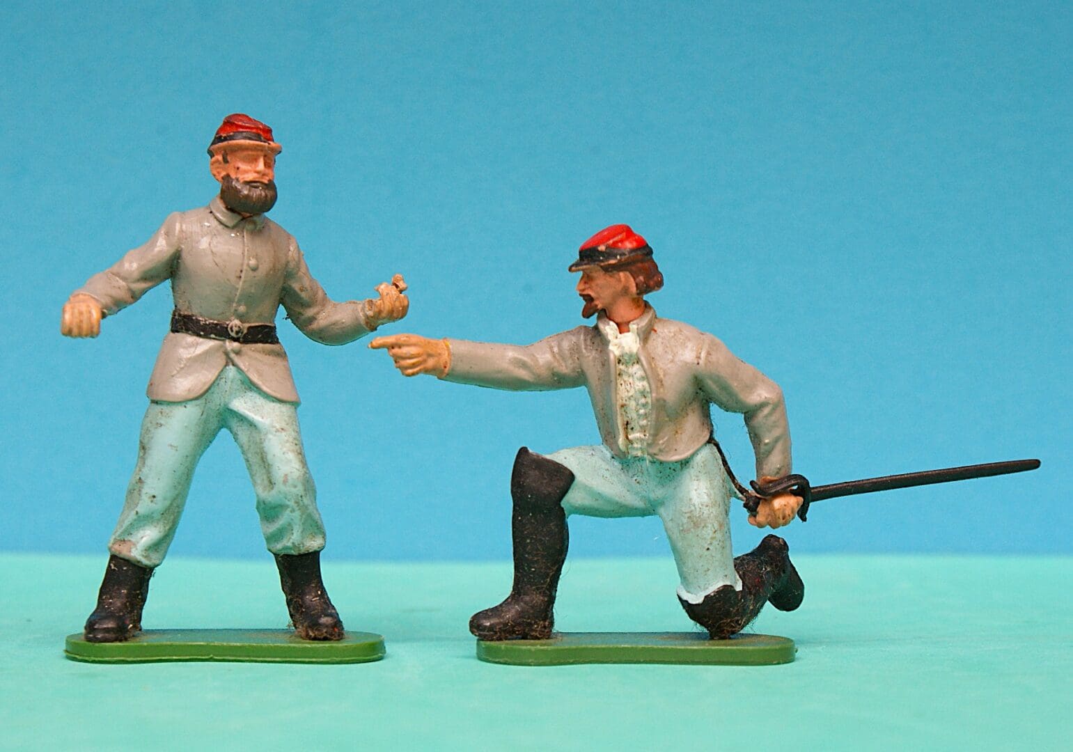 Britains – ‘Eyes Right’ Series – American Civil War – from Set No. 4435 – Confederate Forces Gun Team, comprising: 2 x Crew (matching pair, grey tunics) – Good to VG used condition overall with some wear – [Provenance: from the ‘Sussex’ Civil War Collection]