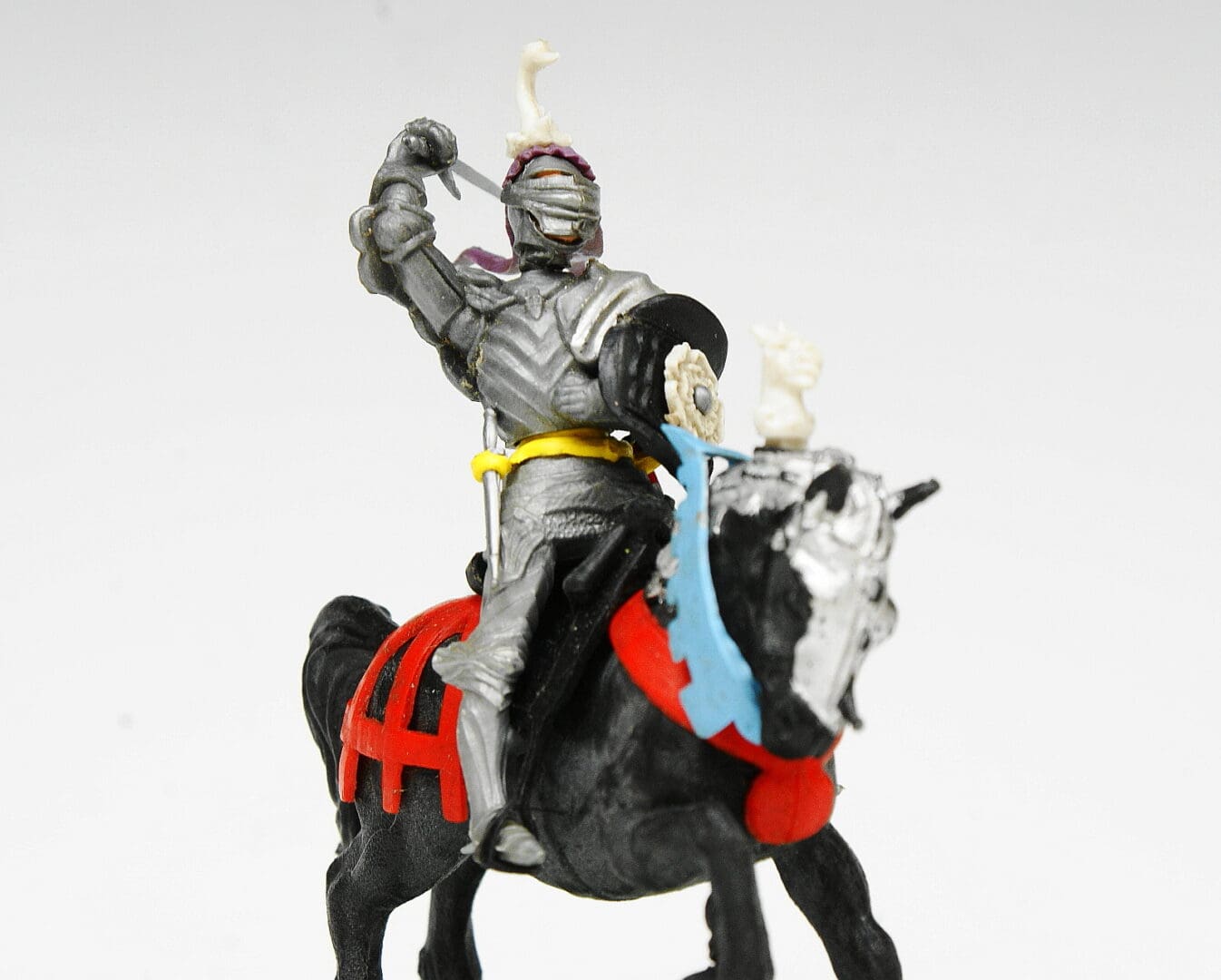 BRITAINS HERALD ‘Wars of the Roses’ 15th Century ‘Swoppet’ Knights – No. H1452 Knight Attacking with sword wearing trailing purple PVC favour on BLACK Horse with light blue reins, white Boar’s Head crest and Red 8-strap PVC caparison. Knight is complete with sword, visor, matching yellow belt, dagger, metal scabbard, black horse saddle, matching black shield etc. and is in Excellent lightly used condition – superb example [Provenance: from the ‘Sussex’ Collection]
