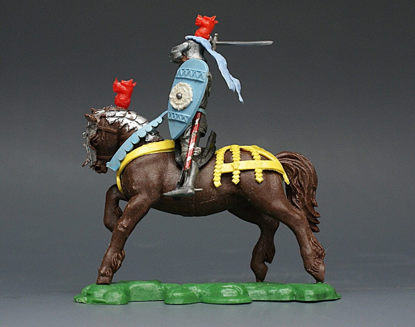 BRITAINS HERALD ‘Wars of the Roses’ 15th Century ‘Swoppet’ Knights – No. H1452 Knight Attacking with sword and trailing light blue favour on Brown Horse with light blue reins, red Bull’s Head crest and Yellow 8-strap ‘Fleur-de-lis’ PVC caparison. Knight is complete with sword, visor, light blue belt, dagger, metal scabbard, black horse saddle, light blue shield etc. and is in Excellent lightly used condition – super example [Provenance: from the ‘Willen Hospice’ shop]