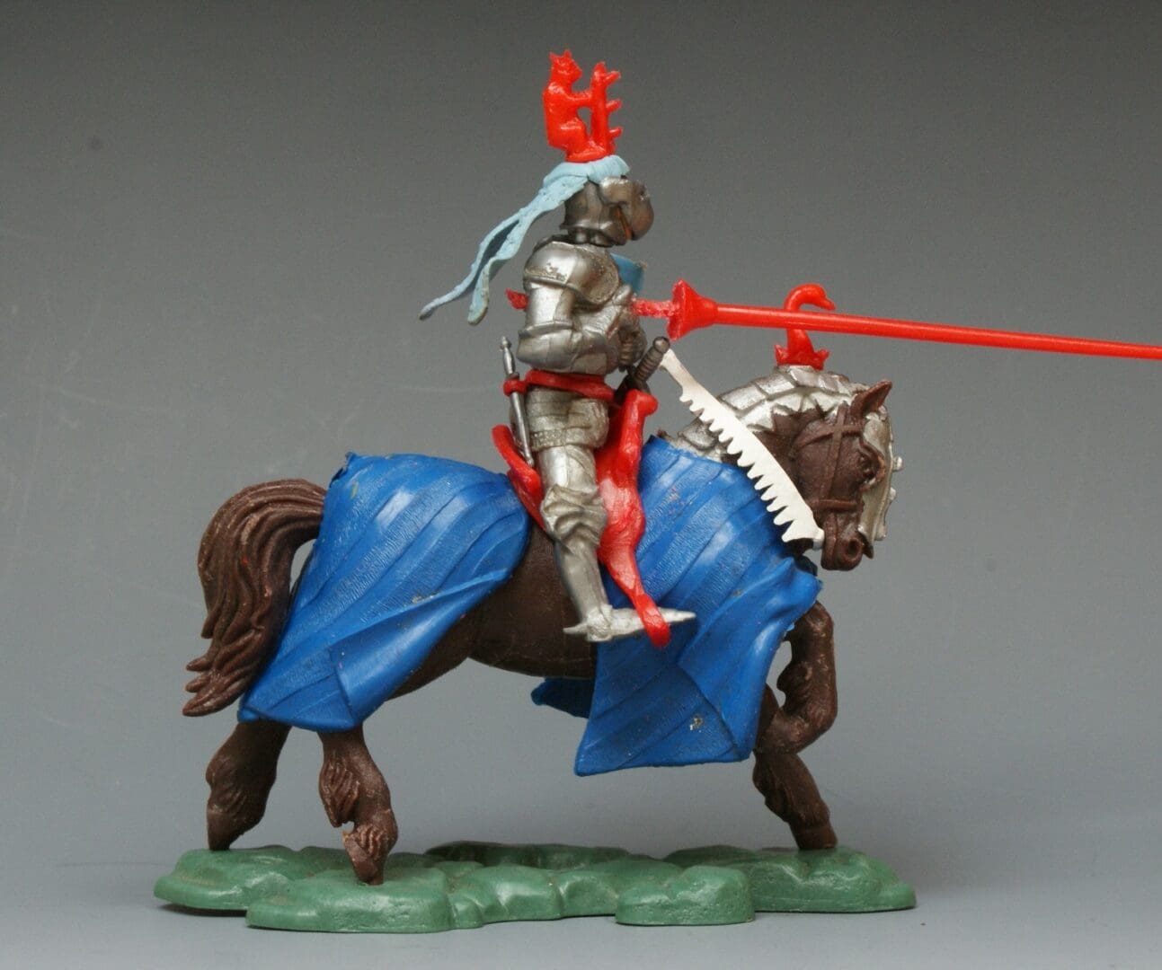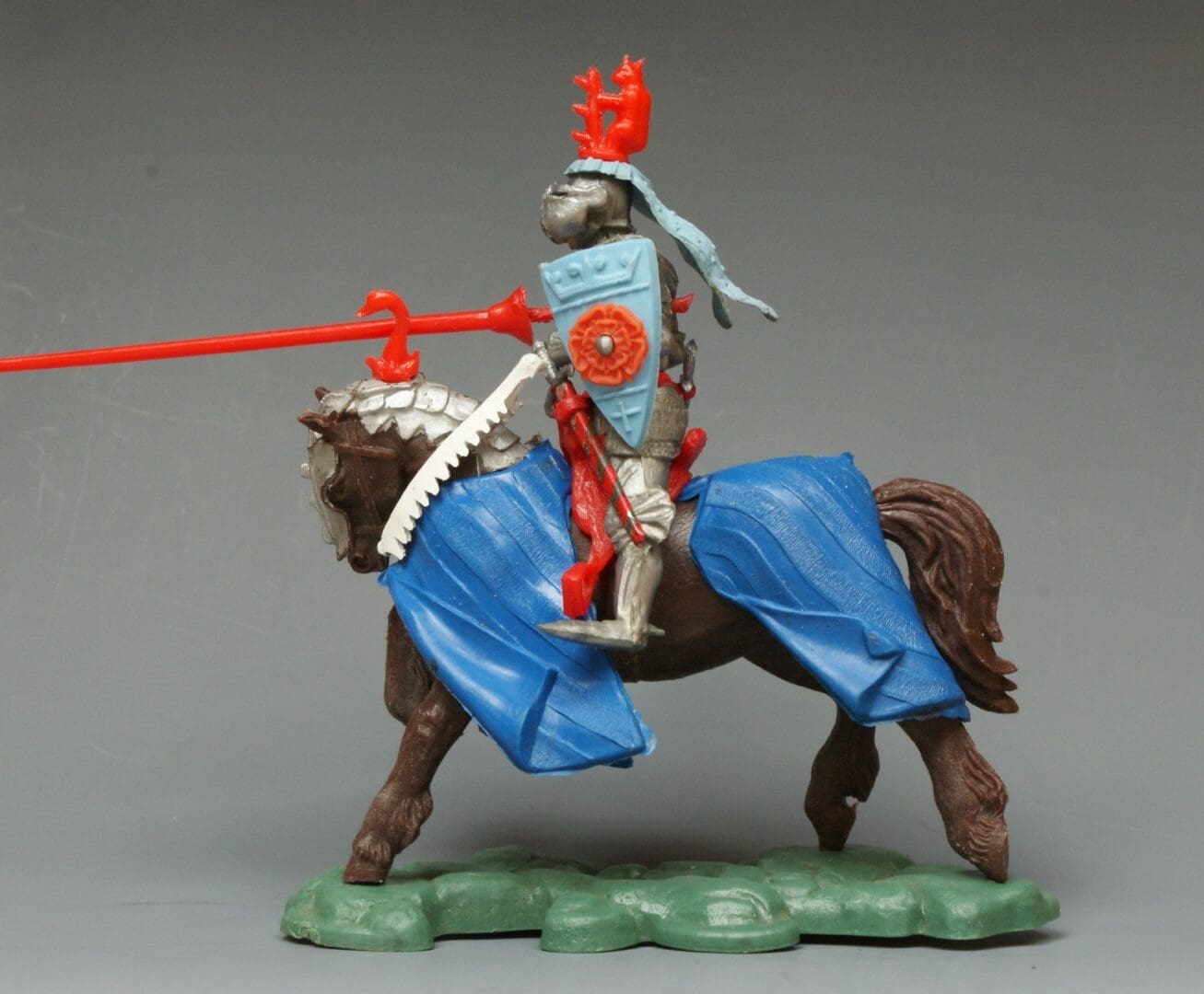 BRITAINS HERALD ‘Wars of the Roses’ 15th Century ‘Swoppet’ Knights – No. H1451 Knight Charging with red lance wearing trailing light blue favour on BROWN Horse with white reins, red crest and ROYAL BLUE horse blanket. Knight figure is complete with white Bear staff crest, sword, visor, purple belt, dagger, metal scabbard, red horse saddle, light blue shield and red Rose emblem etc. and is in Excellent lightly used condition overall with only minor paint loss – Superb in this condition! [Provenance: from the ‘Falkland’ collection of Swoppet C15th]