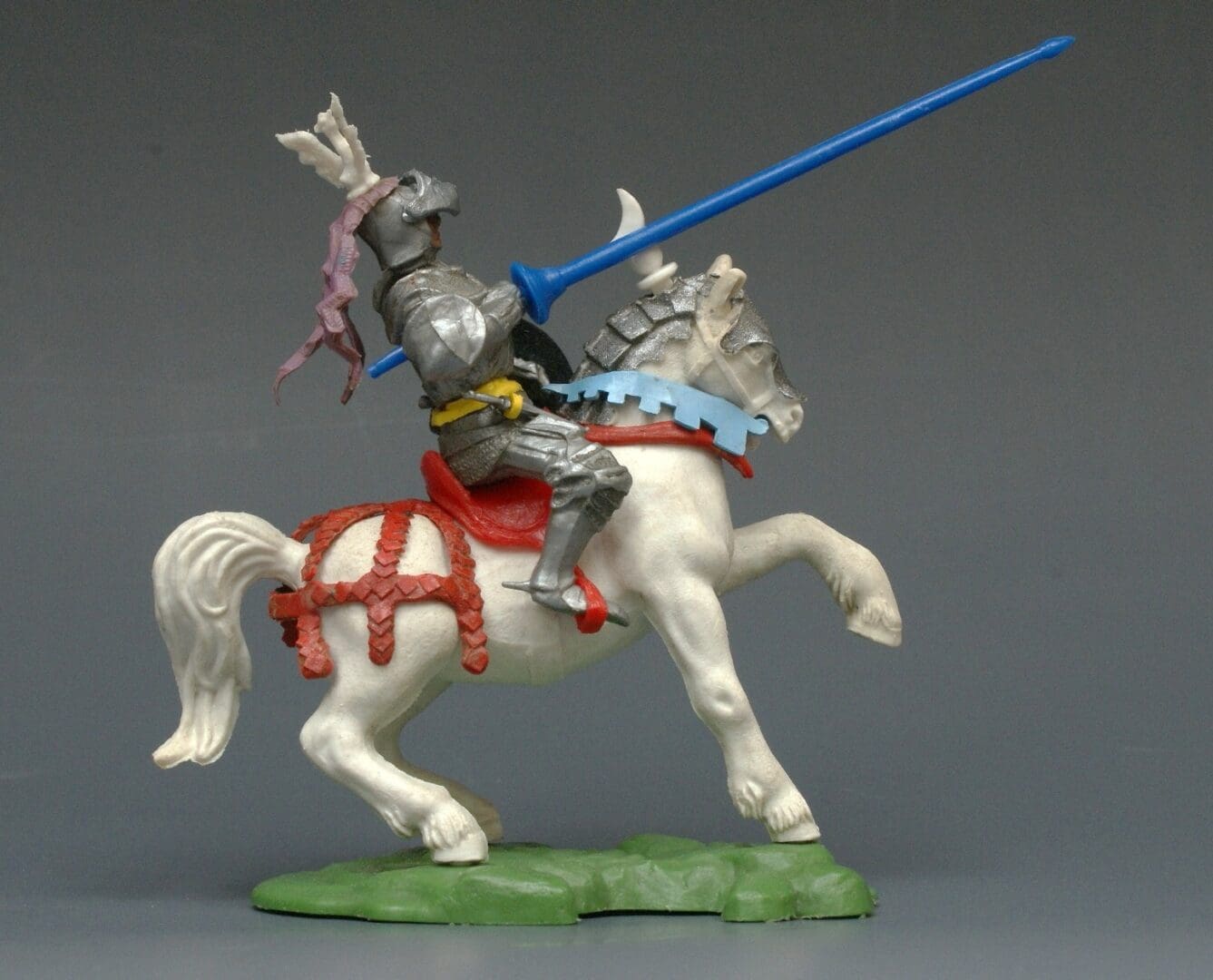 BRITAINS HERALD ‘War of the Roses’ 15th Century ‘Swoppet’ Knights – No. H1453 Knight Defending with Blue lance and Purple trailing favour on White Horse with Light Blue reins and Red 6-strap caparison (split). Model is complete with sword, visor, belt, dagger, metal scabbard, saddle, etc. and is in Good used condition overall. From the ‘Falkland’ Collection.