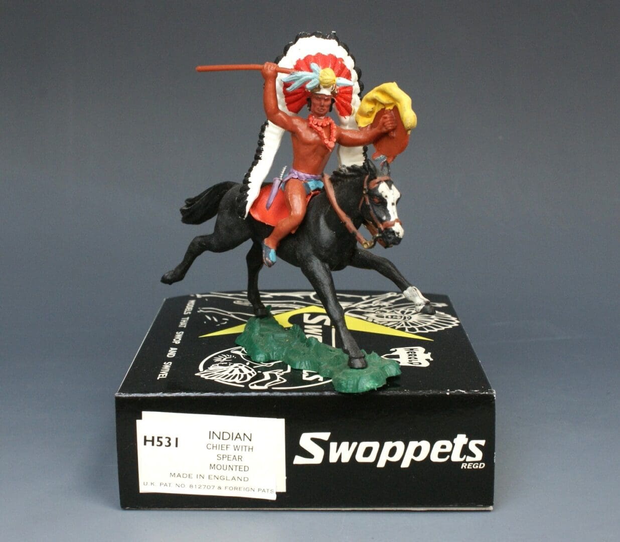 Herald ‘Swoppets’ – No. H531 – Indian Chief with Spear, Mounted (1st Series) – Very Good overall, complete, in superb quality professionally produced limited edition REPRODUCTION LIME /black Herald Wild West ‘Swoppets’ carton with authentic looking crumpled Ecru colour packing tissue – [Provenance: from the Sussex Collection – one of a number of different mounted poses with reproduction 1st issue boxes we have available!]