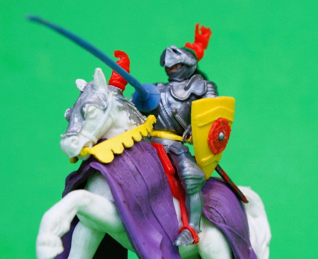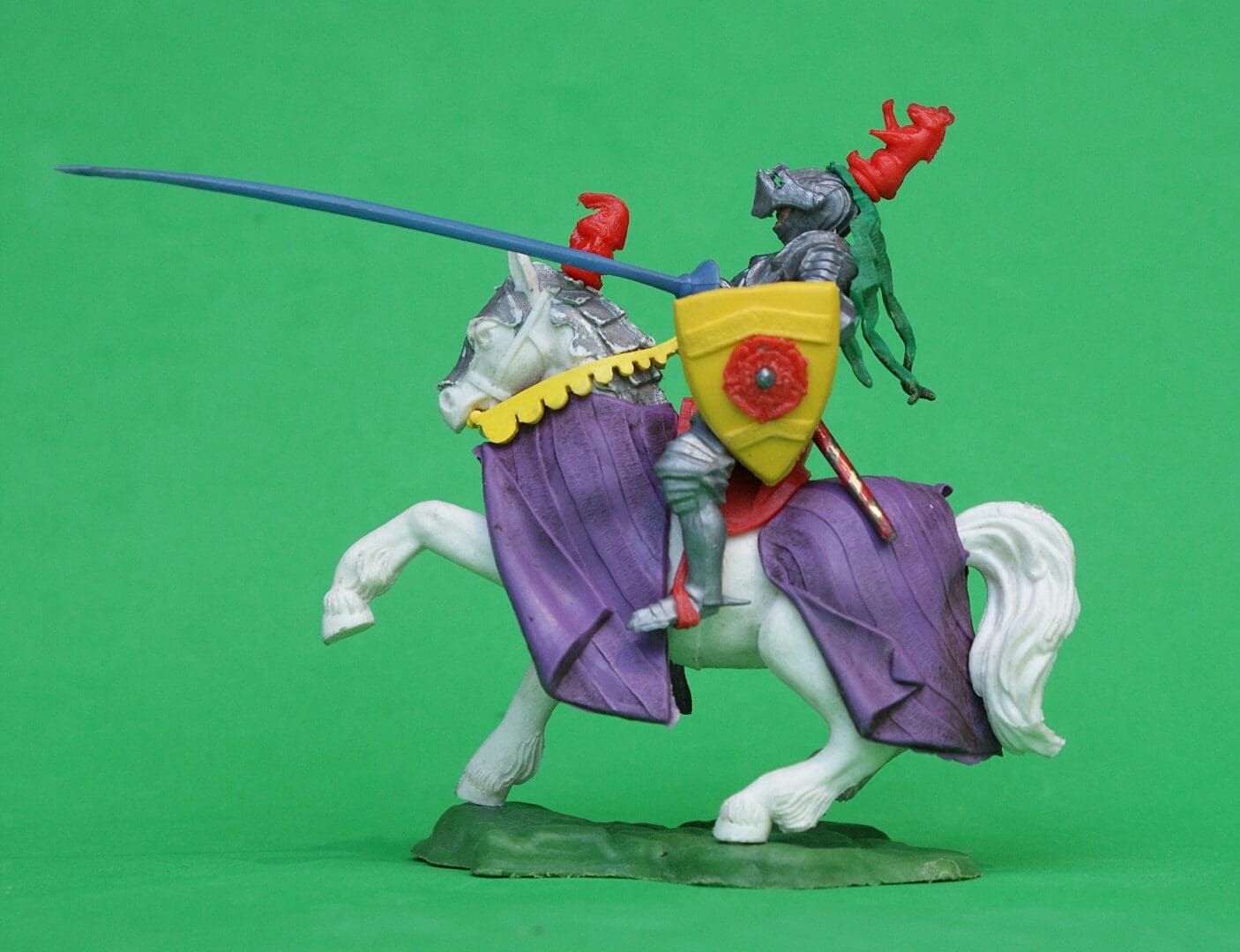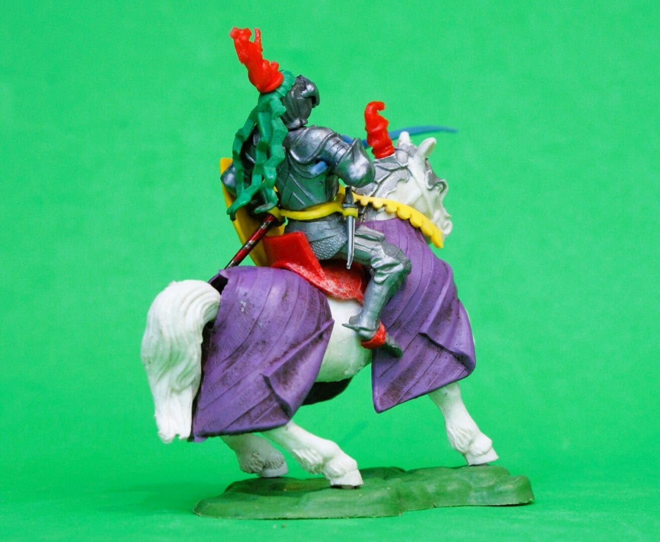 Britains HERALD ‘Wars of the Roses’ 15th Century ‘Swoppet’ Knights – No. H1453 Knight Defending, mounted, with Blue lance and Emerald Green PVC favour on a WHITE rearing horse with PURPLE PVC horse blanket, Yellow reins (Mouldcraft) and Red saddle. Figure is complete with Yellow belt, visor, red crest, dagger, sword, scabbard, shield and red shield boss – generally in Excellent original lightly used condition, with only minor wear – superb! [Provenance: from a recent attic find]