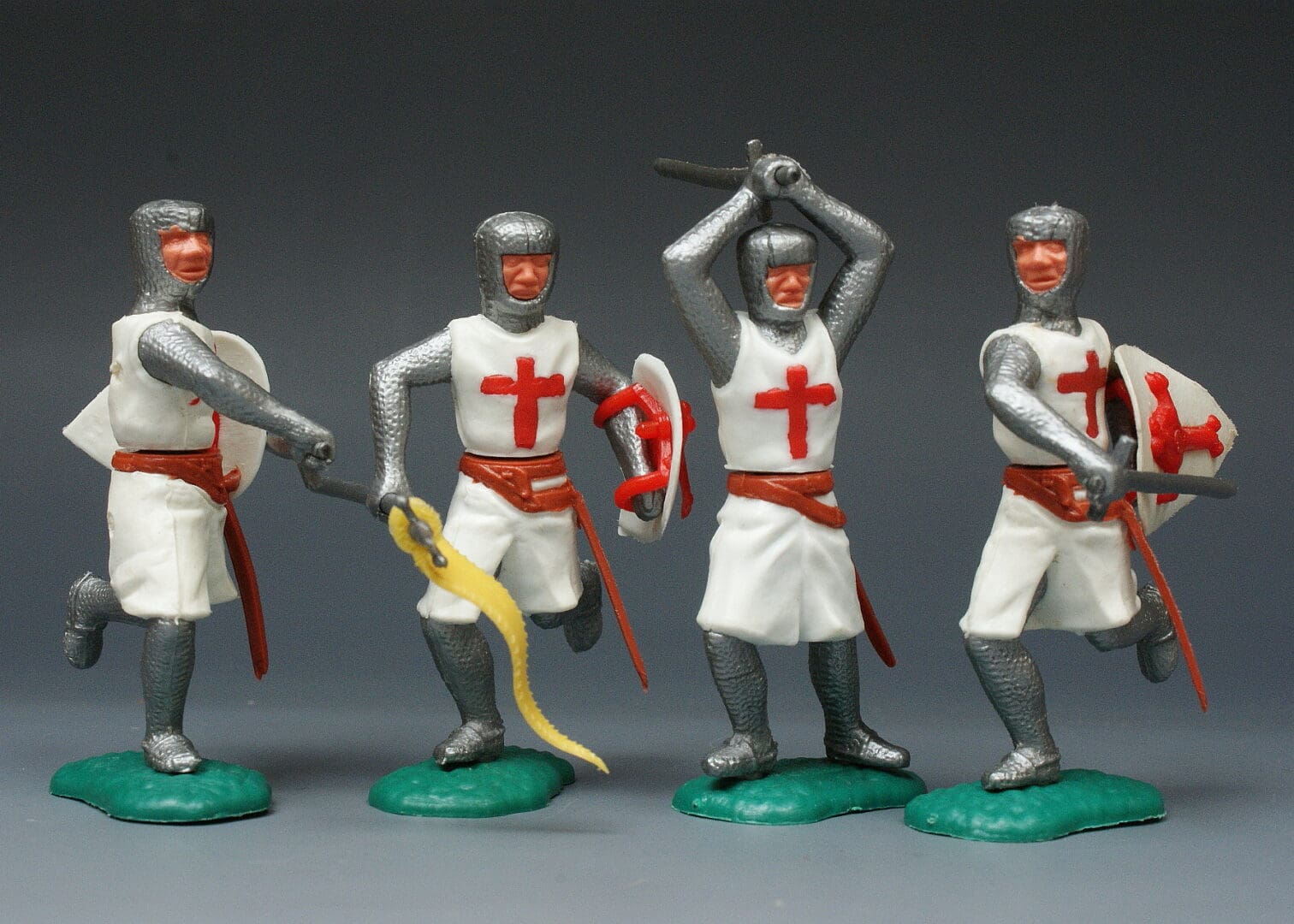 Timpo Toys Series 15 Crusader Knights – 2nd issue figures on foot, distinctive with finer detail to chainmail. Near Mint lightly used condition overall, complete with shields and weapons, later issue green TEXTURED bases date to circa mid-70’s – Superb in this condition – From the ‘Falkland’ Collection [4 figures] *** Sorry now out of stock ***